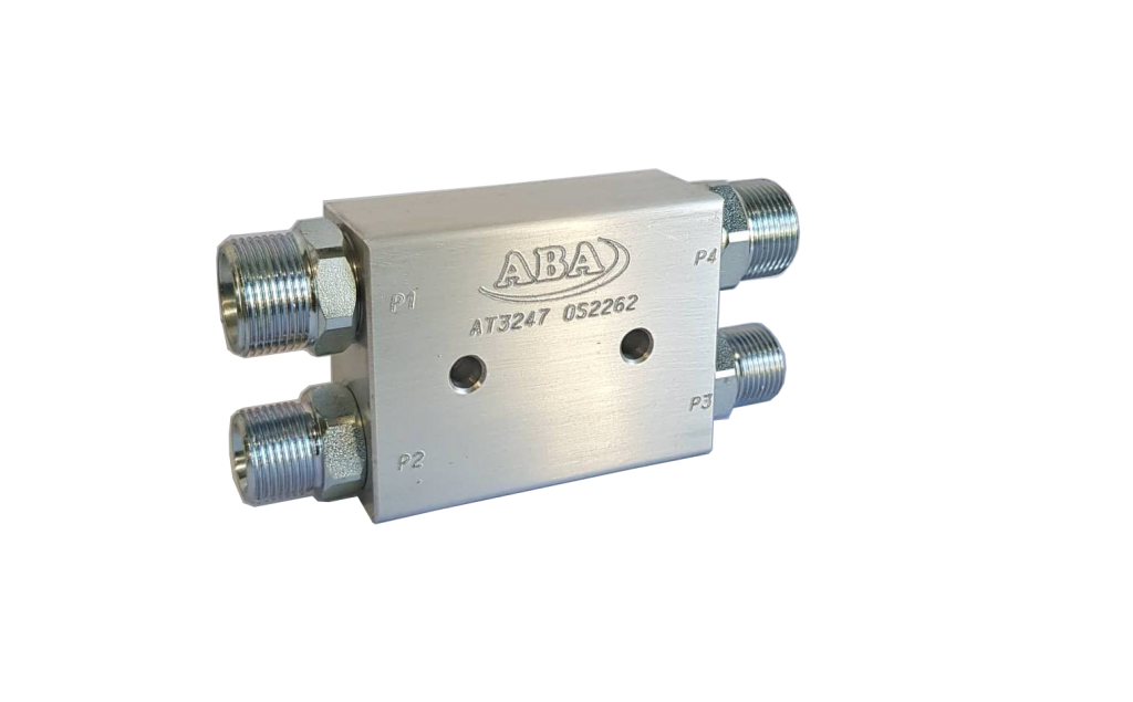 Válvula Alternadora com retenções em (P1, P2 e P3) e entrada de pressão em P4, com nípeis M20x1.5 e M24x1.5